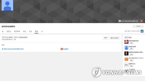 | △ 북한 유튜브 '인기'…구독자 5년만에 6배 늘어 (서울=연합뉴스) 북한의 대남 기구인 조국평화통일위원회가 운영 중인 우리민족끼리의 유튜브 구독자가 23일 현재 1만1천733명으로 집계됐다. 이는 5년 전인 지난 2010년 10월 구독자(1천903명)와 비교해 6배 이상 증가한 수치다. 2015.7.23 nkphoto@yna.co.kr |