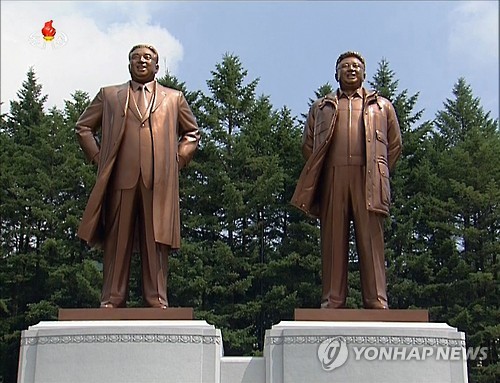 | △ 북한, 김일성·김정일 동상 건립…평성서 제막식 (서울=연합뉴스) 북한이 오는 27일 정전협정 체결일 62주년을 앞두고 지난 22일 평안남도 평성시에 김일성 주석과 김정일 국방위원장의 동상을 세웠다고 조선중앙TV가 23일 보도했다. 동상 제막식에는 김영남 최고인민회의 상임위원장, 박봉주 내각 총리, 최룡해 노동당 비서, 최태복 최고인민회의 의장, 박영식 인민무력부장, 곽범기 노동당 비서, 로두철·김용진 내각 부총리 등이 참석했다. 2015.7.23 nkphoto@yna.co.kr |
