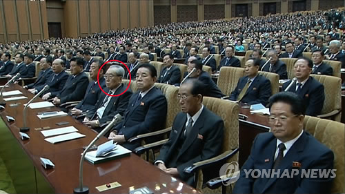 | △ 북한 김기남 노동당 비서가 지난 4월9일 열린 최고인민회의 제13기 3차 회의에서 핵심 당비서임에도 불구하고 주석단이 아닌 방청석에 앉아 눈길을 끌었다. 사진의 붉은 원이 김기남 당비서. |