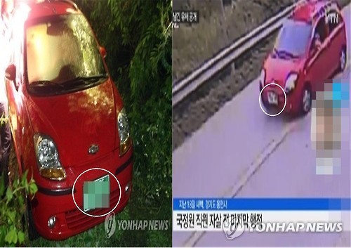 | △ 스스로 목숨을 끊은 국가정보원 직원의 '차량 번호판 바꿔치기' 의혹에 대해 경찰이 "전혀 가능성 없다"는 입장을 재확인했다. 사진은 현장에서 발견된 국가정보원 직원의 차량과 CCTV 화면 간 비교사진. (연합뉴스 자료사진) |