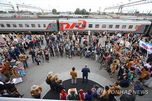 | △ 예카테린부르크 도착한 유라시아 친선특급 (예카테린부르크<러시아>=연합뉴스) 김도훈 기자 = 24일(현지시간) 오전 러시아 예카테린부르크역에서 유라시아 친선특급 열차 환영식이 열리고 있다. 참가단원은 이날 스베르들롭스크주 소재 유라시아 경계비를 방문한 뒤 25일 오전 예카테린부르크를 출발해 26일 러시아 수도인 모스크바에 도착한다. |