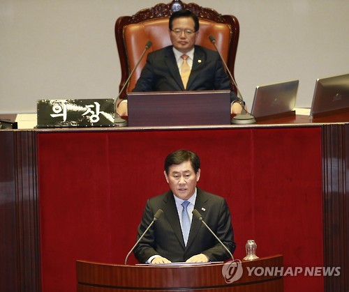 | △ 정부측 의견 밝히는 최경환 부총리 (서울=연합뉴스) 이상학 기자 = 최경환 경제부총리 겸 기획재정부 장관이 24일 국회 본회의장에서 2015년도 제1회 추가경정예산안 등에 관한 정부측 의견을 밝히고 있다. leesh@yna.co.kr |