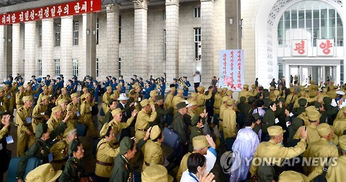| △ 북한이 '전승절'로 선전하는 정전협정 기념일(27일)에 맞춰 평양에서 개최하는 제4차 전국노병대회 참석자들이 지난 23일 평양에 도착하는 모습. (연합뉴스 자료사진) |