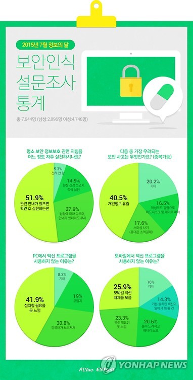 이스트소프트[047560]가 27일 발표한 '2015 사용자 정보보호 보안인식 실태조사' 결과에 따르면 PC와 스마트폰 사용자 7천644명 가운데 33.2%는 보안 수칙을 전혀 실천하지 않거나 안내가 있더라도 무시한다고 응답했다.