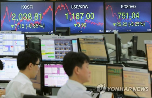이에 코스피는 7.15포인트(0.35%) 내린 2,038.81로 장을 마쳤다.