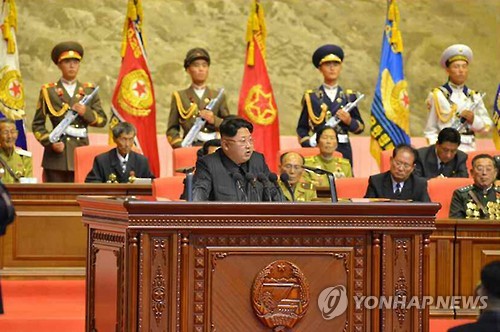 | △ 김정은 북한 국방위원회 제1위원장이 27일 정전협정 62주년을 기념해 북한 내에 조성된 중국인민지원군 전사자 묘지에 화환을 보냈다. 사진은 제4차 전국노병대회에서 축하연설을 하는 김정은 북한 국방위원회 제1위원장. (연합뉴스 자료사진) |