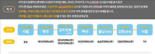 미래창조과학부에 따르면 이 차관과 스타트업 대표 20여명이 참가하는 창조경제 원정대는 이날 제주를 시작으로 31일까지 전주, 부산, 천안, 춘천 등 전국 5개 창조경제혁신센터에서 순회 강연에 들어간다.