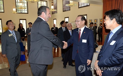 | △ UC어바인대 방문한 황우여 부총리 (서울=연합뉴스) 황우여 사회부총리 겸 교육부 장관이 27일(현지시간) 미국 어바인 캘리포니아대(UC어바인)를 방문, 관계자들과 인사를 나누고 있다. (교육부 제공) |