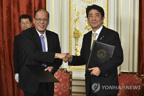 | △ 아베 신조(왼쪽) 일본 총리와 베니그노 아키노 필리핀 대통령이 2015년 6월 4일 도쿄에서 만나 악수하고 있다. (AP=연합뉴스) |