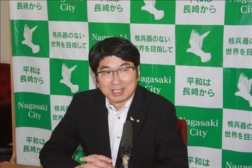 | △ 다우에 도미히사(58·田上富久) 일본 나가사키(長崎) 시장이 지난 27일 시청에서 일본 포린프레스센터(FPCJ) 주최 프레스투어에 참가한 외신 기자들과 회견하는 모습. |