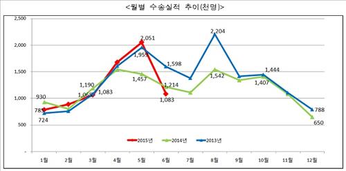 올해 1∼5월까지는 연안여객선 이용객이 2013년 수준을 회복했으나 메르스 사태가 발생한 6월 이용객이 급감했다.