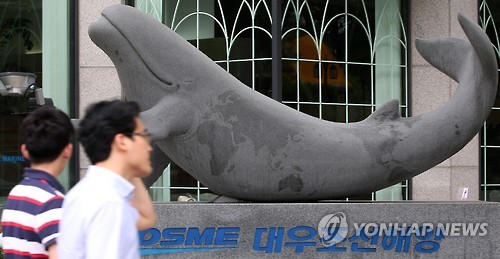 | △ 대우조선, 해양플랜트 악재로 2분기 3조319억 적자 (서울=연합뉴스) 한종찬 기자 = 대우조선해양이 해양플랜트 공기 지연으로 3조원 넘는 분기 적자를 기록했다. 대우조선해양은 올해 2분기 영업손실이 3조318억원으로 전년 동기 대비 적자전환 했다고 29일 밝혔다. 사진은 이날 오후 서울 중구 대우조선해양 빌딩 앞에 설치된 '빅 블루'. ‘빅블루’는 대우조선해양의 공식 캐릭터인 흰수염고래의 이름이다. |