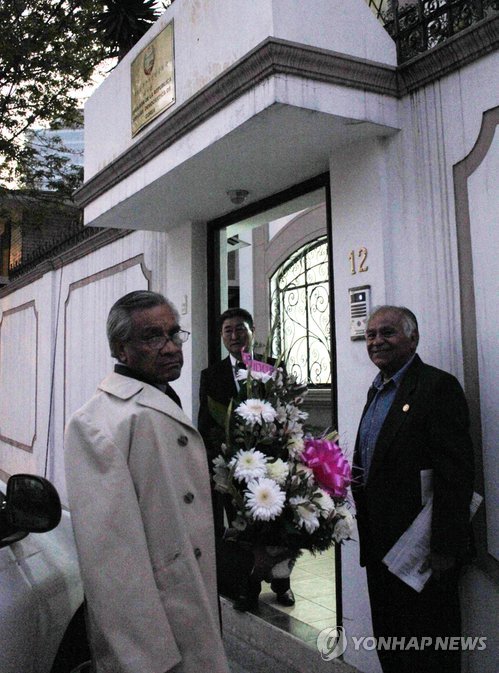 | △ 멕시코 정당인들이 김정일 국방위원장의 빈소가 차려진 멕시코 주재 북한 대사관을 방문하고 있다. 2011.12.20 |