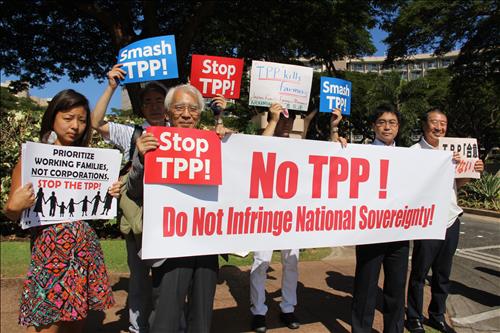 이들은 'TPP 협상 중단하라', 'TPP 합의는 위험하다', 'TPP가 농민들을 죽인다', 'TPP를 박살내자', '기업이 아니라 노동자 가족을 우선시하라', '국가 주권을 침해하지 말라'는 등의 문구가 적힌 피켓을 들고 기습시위를 벌였다.