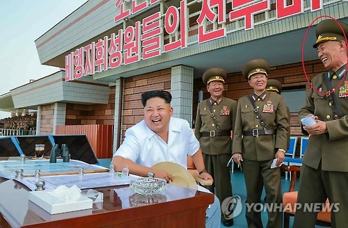 | △ 최영호 북한 인민군 공군사령관 대장 승진 (서울=연합뉴스) 최영호 북한 인민군 항공 및 반항공군(공군) 사령관이 상장(별 3개)에서 대장(별 4개)으로 진급한 사실이 30일 확인됐다. 사진은 별 4개가 달린 대장 견장(붉은 원)을 달고 김정은 국방위원회 제1위원장의 전투비행술 경기대회 현지지도를 수행 중인 최영호 사령관. 2015.7.30 <노동신문> nkphoto@yna.co.kr |