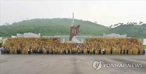 (서울=연합뉴스) 차지연 기자 = 김정은 북한 국방위원회 제1위원장이 정전협정 체결 62주년을 앞둔 지난 25일 열린 제4차 전국노병대회 참가자들과 기념사진을 찍었다고 조선중앙통신이 30일 보도했다.