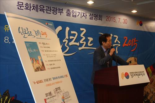 | △ 실크로드경주 대축전을 준비한 경주엑스포 조직위원회의 이동우 사무총장이 30일 프레스센터에서 행사에 대한 설명을 하고 있다. |