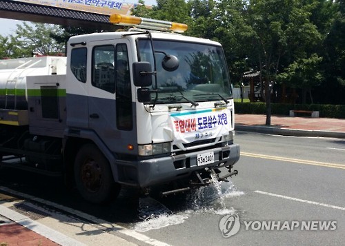 | △ 도로에 물 뿌리기 (경주=연합뉴스) 경주시는 연일 계속되는 폭염으로 달아오른 주요 도로에 살수차로 물을 뿌려 더위를 식히고 있다. 2015.7.30 << 경주시 >> shlim@yna.co.kr |