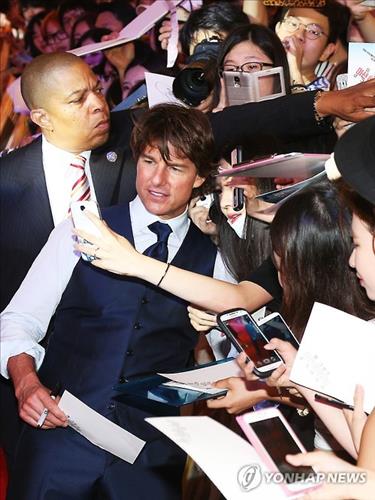 선물을 준비한 팬도 많았다. 팬들은 이번 작품의 대표 액션 장면으로 꼽히는 비행기 장식을 한 케이크 등을 건넸고 크루즈는 놀라는 표정으로 이를 받으며 감사를 표시했다.