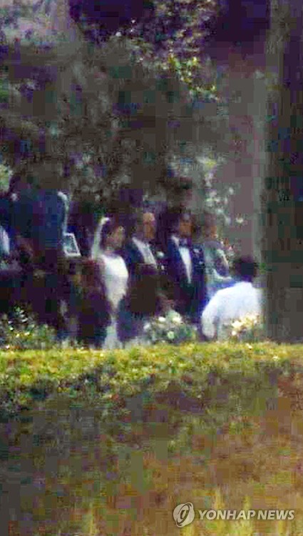 | △ 배용준-박수진 결혼식 (서울=연합뉴스) 배우 배용준(가운데 세사람중 오른쪽)과 박수진(왼쪽)이 27일 오후 서울 광진구 쉐라톤 그랜드 워커힐 애스톤하우스에서 열린 결혼식에서 손님을 맞이하고 있다. 2015.7.27 << 연합뉴스TV 캡쳐 >> photo@yna.co.kr |