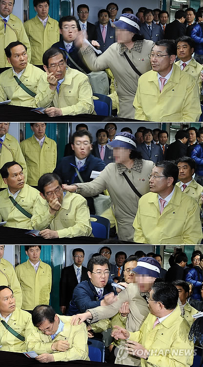 | △ 경기 안산 세월호 정부합동분향소 옆 유가족대기실에서 유족의 뺨을 때린 박모(66·여)씨가 4년 전 박원순 서울시장을 "빨갱이"라 비난하며 때린 전력이 있던 것으로 드러났다. 사진은 지난 2011년 민방위의 날을 맞아 시청역에서 열린 정전대비 지하철 대응훈련을 참관하던 박원순 시장이 폭행 당하는 모습. (연합뉴스 자료사진) |