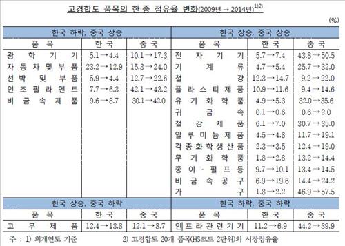 인도 수입시장에서 한-중 경합도가 높은 20개 품목의 점유율 변화(2009∼2014년)를 보면 자동차 및 부품, 광학기기, 선박 및 부품, 인조필라멘트, 비금속제품 등 5개 품목에서 중국의 점유율이 상승한 반면 한국은 떨어졌다.