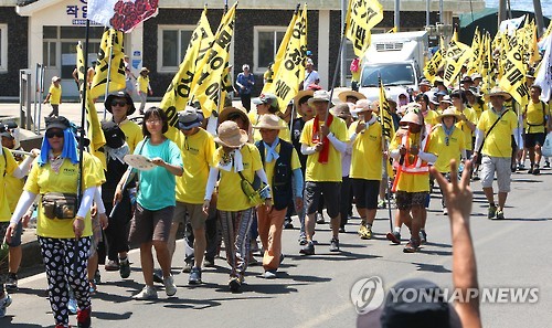 | △ (서귀포=연합뉴스) 변지철 기자 = 제주 해군기지(민군복합형 관광미항) 건설 반대운동 3천일을 이틀 앞둔 1일 해군기지 건설중단을 촉구하며 제주 서쪽 지역을 도보로 순례한 '2015 강정생명평화대행진' 서진단이 5박 6일간의 일정을 마무리하고 강정포구를 지나 해군기지공사장으로 걸어가고 있다. 2015.8.1 bjc@yna.co.kr |