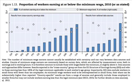 3일 경제협력개발기구(OECD)의 '고용 전망 2015'(OECD Employment Outlook 2015) 보고서에 따르면 회원국 20개국을 대상으로 조사한 결과, 최저 임금 또는 그 이하 소득의 노동자 비율은 평균 5.5%다.