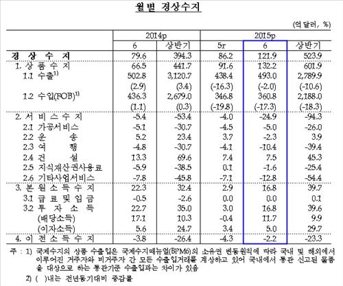6월 경상흑자 121.9억달러…40개월째 사상 최장 흑자행진