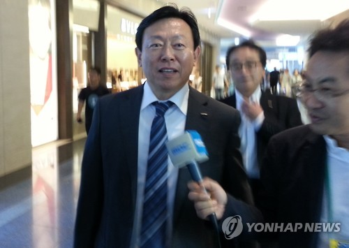 | △ 출국장 향하는 신동빈 롯데그룹 회장 (도쿄=연합뉴스) 조준형 특파원 = 신동빈 롯데그룹 회장이 3일 오전 한국으로 출국하기 위해 일본 하네다공항에 도착, 취재진의 질문을 받고 있다. 2015.8.3 jhcho@yna.co.kr |