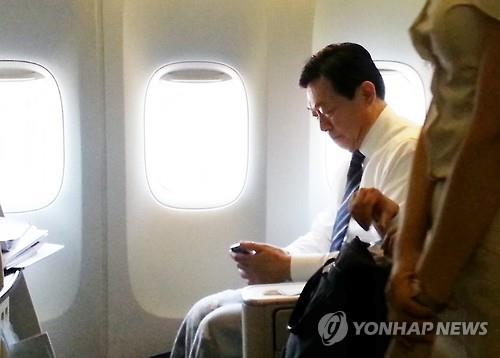 승무원에게 한국 신문들을 달라고 부탁한 신 회장은 무릎에 담요를 덮은 채 롯데 경영권 분쟁 관련 기사가 1면에 실린 한국 신문 4∼5개를 찬찬히 읽었다.