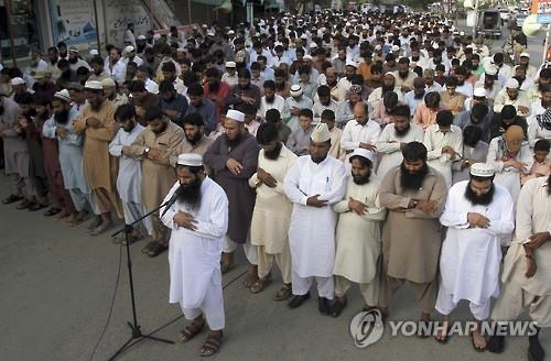 | △ 탈레반 지도자인 물라 무하마드 오마르를 지지하는 파키스탄 종교단체 '자마투드 다와'가 2일 파키스탄 카라치의 사원 밖에서 오마르의 사망을 추모하는 기도를 하고 있다.(AP=연합뉴스) |