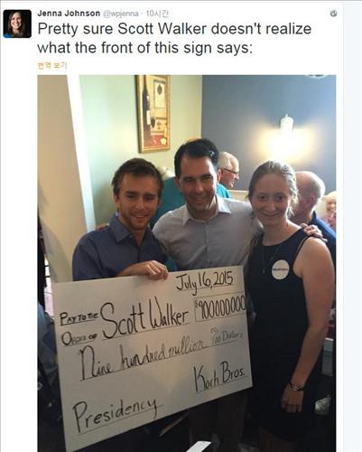 워커 주지사가 흔쾌히 승낙하며 포즈를 취하는 순간 맥팔랜드는 손에 들고 있던 팻말을 휙 뒤집었다. 뒤집힌 팻말엔 9억 달러가 적힌 수표 모양이 나타났다.