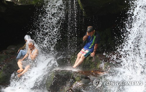 | △ 이색 냉수욕으로 더위 날리는 제주 피서객 (서귀포=연합뉴스) 고성식 기자 = 제주지방에 연일 폭염특보가 내려지는 등 30도를 웃도는 무더위가 지속되는 가운데 2일 서귀포시 돈내코 원앙폭포를 찾은 피서객들이 한라산에서 내려온 시원한 폭포수를 맞으며 더위를 식히고 있다. 이날 원앙폭포에서는 제2회 돈내코 계곡 원앙축제가 열려 폭포수 맞기 등의 행사가 진행됐다. 2015.08.02. koss@yna.co.kr |