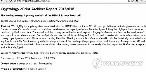 최근 '(정보)유출 배터리:HTML5 배터리 상태 API' 제목의 보고서를 통해 이런 문제점을 발표한 연구진은 배터리가 오래됐거나 전력이 소모된 상태일수록 웹 이용자 추적에 사용될 디지털지문을 남길 위험이 더 커진다고 설명했다.