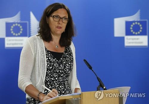 | △ (브뤼셀 EPA=연합뉴스) 세실리아 말름스트룀 EU 통상담당 집행위원이 4일 기자회견에서 EU와 베트남 간 자유무역협정(FTA) 합의를 발표하고 있다. |