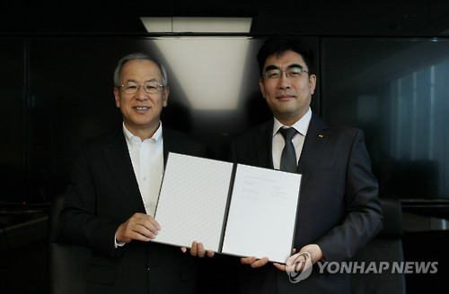 | △ KT, 일본 NEC와 5G 기술 공동개발 (서울=연합뉴스) 5일 광화문 KT east 사옥에서 KT 융합기술원 이동면 원장(오른쪽)과 NEC �이치로 테지마 통신사업 부문장이 5세대(5G) 이동통신 기술을 공동 개발하기로 하는 양해각서를 체결하고 있다. (KT 제공) |