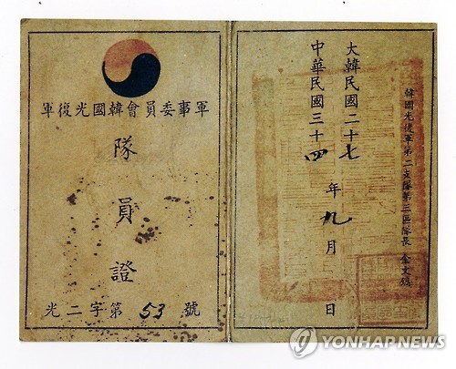 | △ 전쟁기념관에 전시되는 '한국광복군 대원증' (서울=연합뉴스) 오는 7일부터 11월 15일까지 광복 70주년을 기념해 전쟁기념관에서 열리는 특별기획전 '독립전쟁, 그 위대한 여정'에 전시되는 '한국광복군 대원증'. 2015.8.5 << 전쟁기념관 제공 >> photo@yna.co.kr |