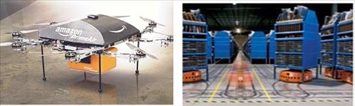 아마존(Amazon)의 프라임에어 서비스는 드론을 이용해 물류센터에서 반경 16㎞ 이내 주문지까지 30분 안에 배달이 가능하다.