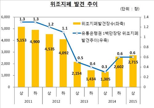(서울=연합뉴스) 김지훈 기자 = 한국은행은 올 상반기 중 발견된 위조지폐가 2천715장으로 작년 하반기보다 4.3%(113장) 늘었다고 5일 밝혔다.