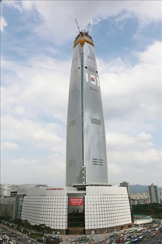 롯데월드타워는 123층, 지상 555m 높이로 내년 말 완공 목표로 건설 중이다. 완공되면 국내에서 최고층 건축물이 된다. 지난 4일 현재 중심부 핵심벽체(Core Wall)는 103층까지, 외벽(Curtain Wall)은 93층 공사가 진행 중이다.