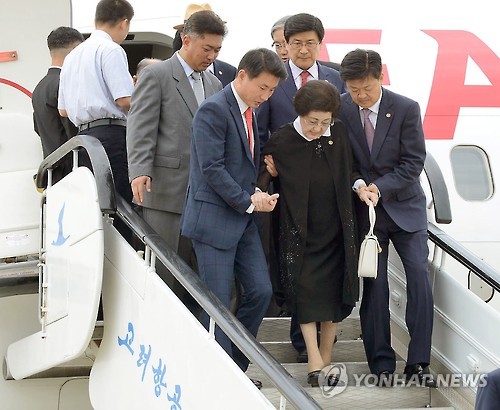 | △ 평양 도착한 이희호 여사 (평양 교도=연합뉴스) 김대중 전 대통령의 부인 이희호 여사가 5일 오전 북한 평양 순안국제공항에 도착해 비행기에서 내리고 있다. |