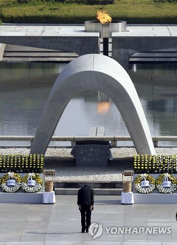 | △ 6일 히로시마 원폭 희생자 위령식에서 머리 숙인 아베 총리(AP.연합뉴스) |