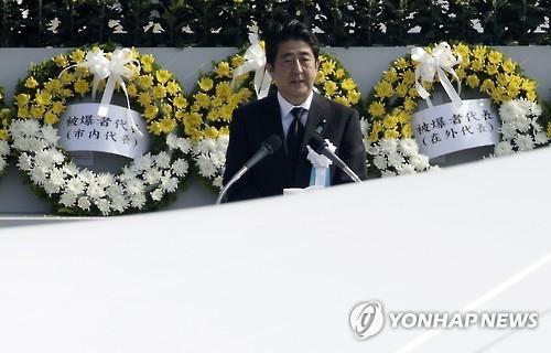 | △ 6일 히로시마에서 열린 원폭 희생자 추모의식에 참석한 아베 신조 일본 총리(AP=연합뉴스) |