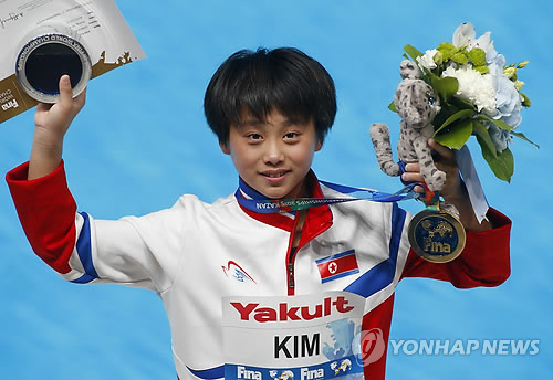| △ 북한의 김국향이 러시아 카잔 아쿠아틱스 팰리스에서 지난달 30일(현지시간) 열린 2015 세계수영선수권대회 다이빙 여자10m 플랫폼 결승에서 1위를 차지했다. 사진은 김국향이 금메달을 목에 걸고 포즈를 취하고 있는 모습. (AP=연합뉴스 자료사진) |