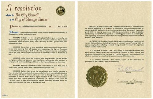 이어 "시카고 시의회는 일본군 위안부 억류를 포함한 모든 인권 침해를 규탄한다"며 "한인사회가 위안부 피해자 문제를 공정하고 공개적으로 기록에 남기고, 이 문제에 대한 인식을 제고·교육하기 위해 쏟는 노력에 박수를 보낸다"고 덧붙였다.