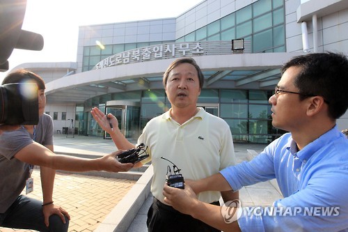 | △ 이상 증상을 보이는 것으로 알려진 금강산 지역의 소나무 상황 파악을 위해 지난달 29일 방북했던 조사단의 한 관계자가 이틀 후인 31일 오후 동해선남북출입사무소를 통해 귀경해 취재진에게 현지 상황에 대해 설명하고 있다. |