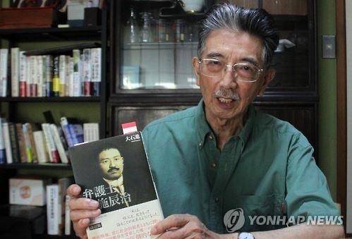 | △ 후세 다쓰지(布施辰治 1880∼1953) 변호사의 외손자인 오이시 스스무(大石進·80) 씨가 연합뉴스의 인터뷰에 응하며 자신이 쓴 '변호사 후세 다쓰지'라는 책을 들어 보이고 있다. |