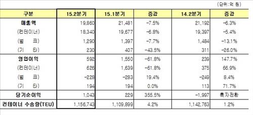 당기순이익은 달러화 강세에 따른 외화 환산이익과 터미널 지분 매각 이익 등이 반영돼 1천43억 원을 달성하며 전년 동기 대비 흑자 전환했다.
