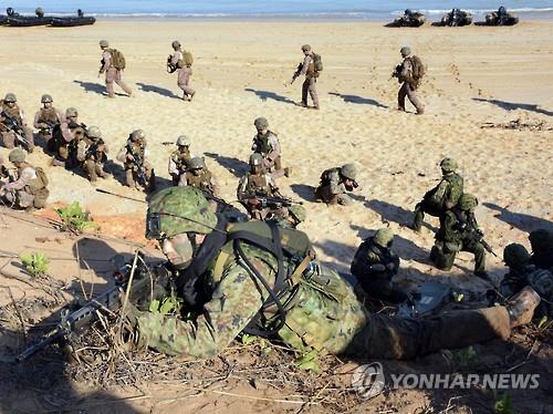 | △ 2015년 7월 11일 호주 북부의 준주(準州)인 노던 테리토리의 포크베이 지역 해안에서 미군과 호주군의 연합군사훈련에 처음 참가한 일본 자위대원이 미국 해병대원과 함께 총기를 들고 섬 탈환 작전을 수행 중이다.(교도=연합뉴스) |